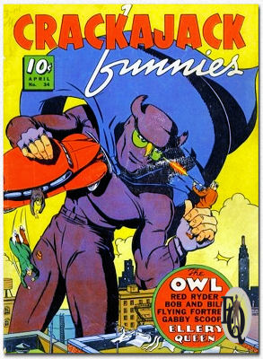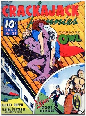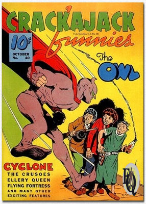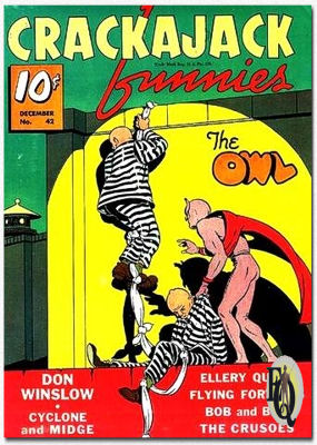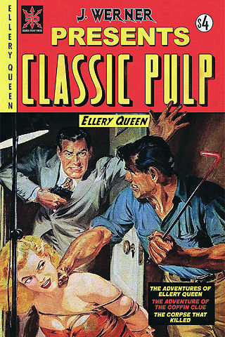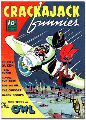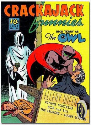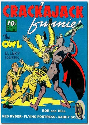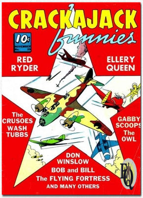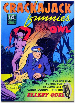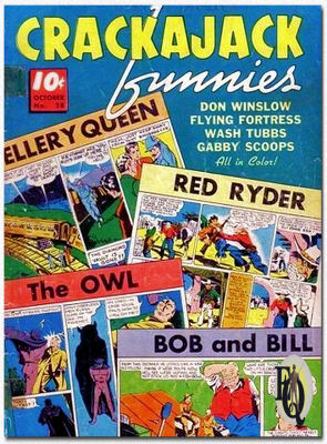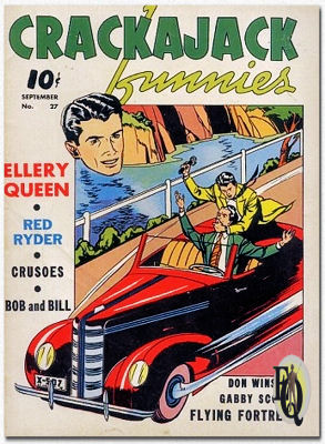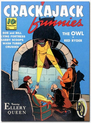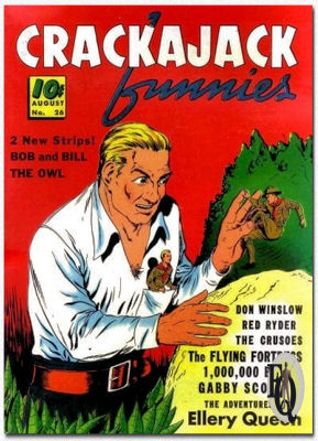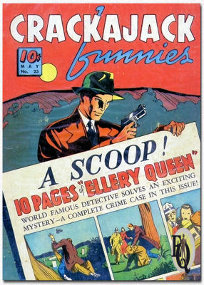 Boven (van L naar R en van boven naar onder): De kaften van de Crackajack Funnies N°23 tot N°34) waarin Ellery Queen verhalen waren terug te vinden. Nummer 23 met "The Adventure of the Coffin Clue" gebaseerd op het kortverhaal "The Adventure of the Invisible Lover". Nummer 24 met "The Adventure of the Blood Red Stamp" vrij getrouw gebaseerd op "The Adventure of the Penny Black". Boven (van L naar R en van boven naar onder): De kaften van de Crackajack Funnies N°35 to N°42. Crackajack Funnies overleefde zijn EQ-series met slechts één uitgave het eindigde met #43 in januari 1942. Pas zeven jaar later zou Ellery als stripverhaal terug z'n opwachting maken...