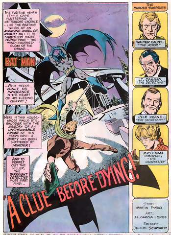 | Boven rechts: Detective Comics No. 459 - Mei 1976 Op de kaft zien we Alfred Pennyworth, de naderende politie, een zich ontmaskerende Batman en Elliot Quinn’s lichaam. (Tekeningen: J.L.Garcia Lopez - Editing: Julius Schwartz) | |