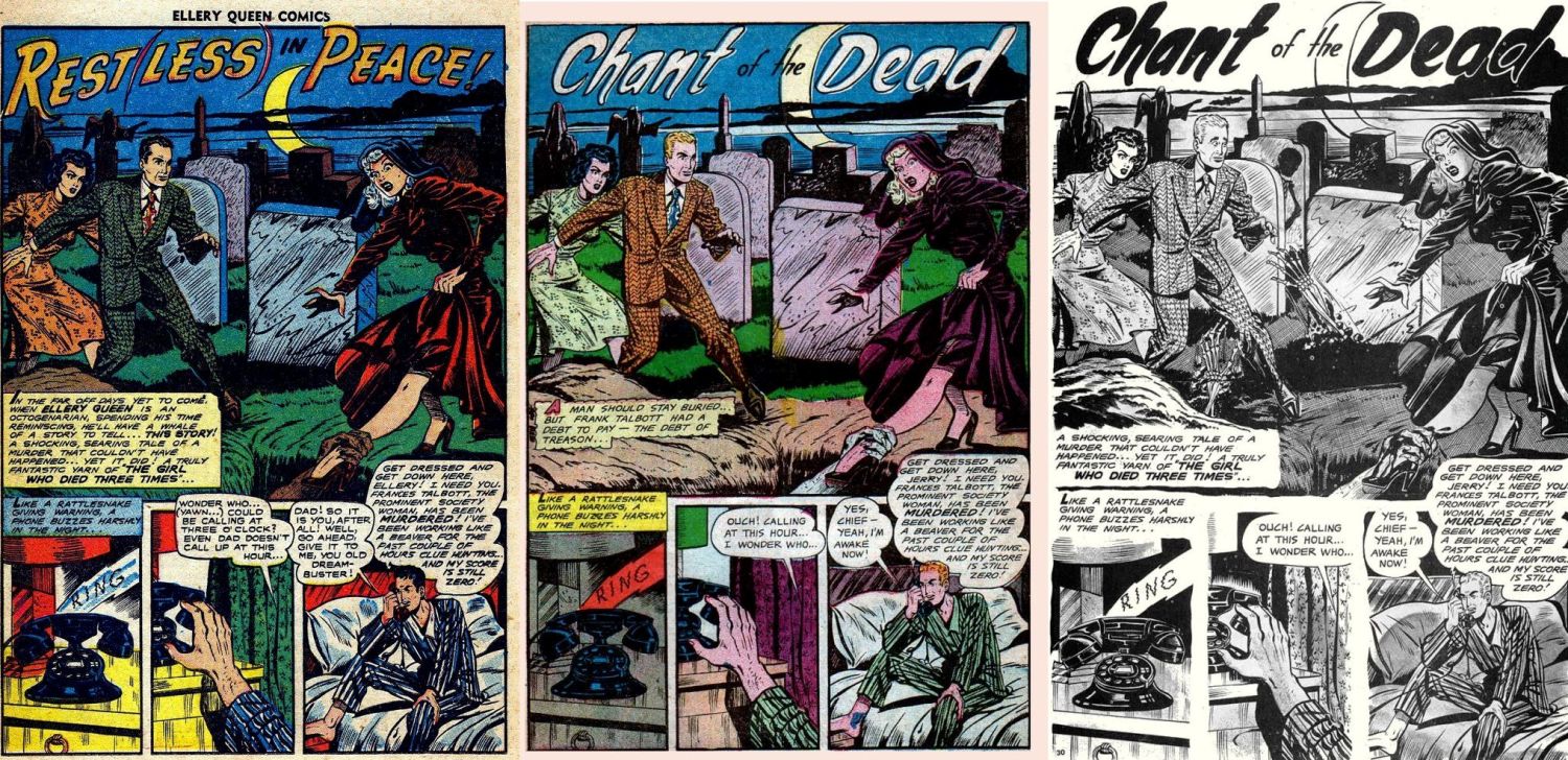 "Rest(less) in Peace" verscheen eerst nog Ellery Queen #1, 1949 maar vervolgde zijn bestaan als "Chant of the Dead" wanneer het werd heruitgegeven in Strange Fantasy#2, 1952. Ellery was tegen die tijd Jerry geworden. Later vonden we het nog terug in 2 Eerie Publications Tales of Voodoo (v2, 1968) en Terror Tales (v3, 1969) als een 7 pagina zwart-witte reproductie met enkele (bloed, vleermuizen) aanpassingen. Tot slot werd in Horror Tales (v2, 1969) nog een 5 pagina lange versie gepubliceerd. |