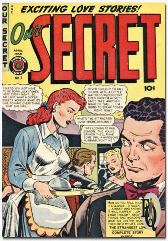| Boven: Origineel tekenwerk voor het Our Secret verhaal "Kiss and Tell" '(1950). In het eerste paneel kun je nog de originele benamingen terugvinden van "Ellery" en "Nikki". In het laatste paneel werd via kleef en plakwerk 'oude stijl' van "Ellery" "Blake" gemaakt. | |