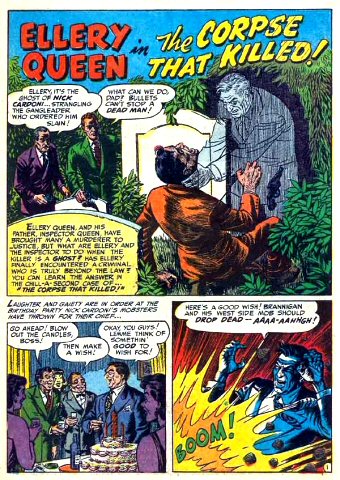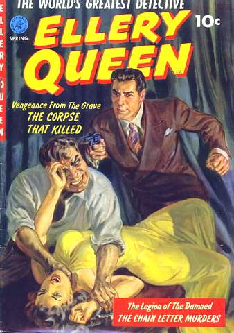 | Boven: Ziff Davis' Ellery Queen bevatte: "Vengeance From the Grave" - "The Corpse That Killed" - "The Legion of the Damned" - "The Chain Letter Murders" en Slippery Slim in "The Hopeless Diamond". "The Corpse That Killed" verscheen digitaal gerestaureerd in 2020 in een, door Source Point Press publiceerde, collectie van Ellery Queen stripverhalen in de reeks "J. Werner Presents Classic Pulp" (29 apr 2020) onder de naam: Classic Pulp: Ellery Queen: Oneshot. | |
