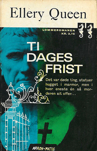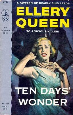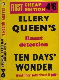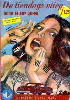 Een nieuw bezoek aan Wrightsville, is het de eerste van de "aan-zichzelf-twijfelende" Ellery Queen verhalen en nog maar eens voorzien van een "dolgedraaid" eind. Ronduit briljante portretteringen. Eén van de allereerste Queen's die ik onder ogen kreeg en het deed me onmiddellijk aan Tien Kleine Indianen terugdenken. De verwijzing was ook niet zo moeilijk want toen was Agatha Christie makkelijk de populairste van de twee. Het meest in het oogspringende echter was de aangewende fair play. Christie's detectives hadden altijd één of andere verborgen aanwijzing gezien of hadden toegang tot bepaalde informatie belangrijk om het mysterie tot een correcte eind te brengen. Terwijl hier bij Queen men een eerlijke kans krijgt aangeboden om het mysterie volledig op te lossen op eigen kracht. Film: Ten Days' Wonder. De Nederlandstalige vertaling De Tiendagsvlieg werd in 1950 uitgegeven bij Pyramide romans was zowat de eerste Nederlandse echte pocketserie (er verschenen 21 delen tussen 1948 en 1950). |