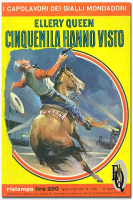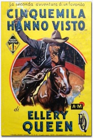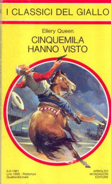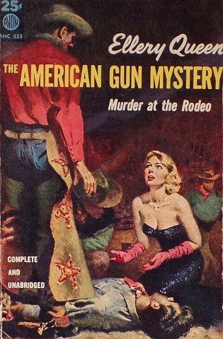 by Margaret Germond - Tuesday, June 13. 1933 "Ellery Queen biedt opnieuw een probleem in deductie aan dat, voor zover het zijn hoofdrolspelers en zijn actie betreft, zich net zo goed had kunnen afspelen in de pionierstijd van Texas of Wyoming waar zich een oplossing had kunnen aandienen, maar het wordt geprojecteerd in de, zeker niet minder, wilde en woelige setting van New York City in de huidige tijd. Samen in het grote Colosseum van Tony Mars, promotor van diverse soorten van ontspanning, en twintig duizend toeschouwers die zichzelf hees riepen in bewondering van de gebruikelijke stunts eigen aan een eerste klasse rodeovoorstelling. Ook aanwezig in die immense menigte van de mensen: Inspecteur Queen, zijn zoon Ellery en de immer trouwe Djuna, aan wiens smeekbede om hem mee te nemen naar de rodeo zijn niet konden weerstaan. Naast de grote Tony Mars zelf zaten naast de Queens en Djuna in dezelfde box, onder andere Mara Gay, actrice uit Hollywood, en Kit Home, de geadopteerde dochter van Buck Horne, ooit een goede ruiter en schutter. Horne werd hier zijn kans gegeven op een heuse comeback door een ogenschijnlijk helderziende en box-Office specialist Tony. Dan is de tijd aangebroken waarbij Buck Horne's in de arena verschijnt luid aangekondigd door zijn oude en volleerde vriend Wild Bill Grant, die de menigte toeschreeuwt dat de grote Buck Horne, met achter zich wel veertig ruiters, de grootste stunt van de rodeo zal uitvoeren. Buck rijdt binnen, met eenenveertig en niet veertig paarden achter zich met daarop mannen die het zaagsel in een wolk achter zich opkloppen, op om op aangeven van hun leider gelijktijdig te schieten. Een ogenblik later stort de onfortuinlijke Buck van zijn paard, recht door het hart geschoten. Eenenveertig ruiters en twintigduizend toeschouwers, en elk van hen een mogelijke verdachte! Geen makkelijk taak voor de boeg voor de Inspecteur en zijn nieuwsgierige zoon maar ze beginnen er aan. Zowat een week later herstarten de voorstelling van de rodeo alhoewel het mysterie van Buck's dood nog niet is opgelost. Bij de heropening zijn opnieuw twintig duizend toeschouwers aanwezig en precies dezelfde groep genodigden in de box van Tony Mars, met een identieke voorstelling als diegene waarin Buck zijn leven verloor, en zowaar op precies dezelfde plaats in de arena wordt een andere ruiter gedood met een kogel door het hart uit exact dezelfde revolver waarmee ook de eerste man om het leven kwam. De lezer krijgt de gelegenheid op de moordenaar te identificeren en te veroordelen. Een grote uitdaging zelfs voor de meest verstokte fans van detective verhalen." |