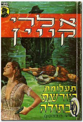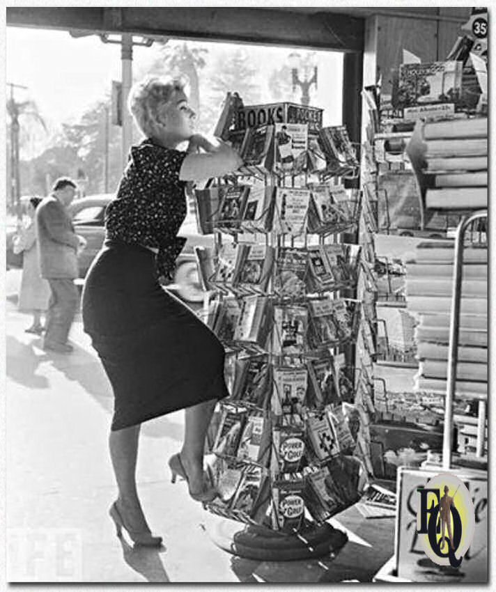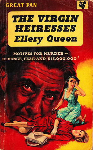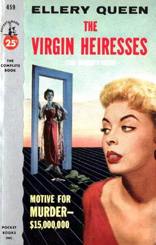 Caribische Zee. Onder: Kim Novak poseert voor een boekenstandaard waarin de Pocket Book uitgave van Ellery Queen's The Virgin Heiresses (1954) te koop wordt aangeboden (middenste rij, derde van onderaan). Klik voor een grotere versie. |