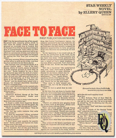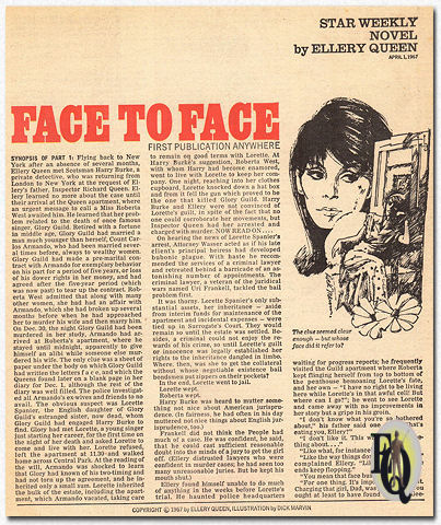 | Boven: Face to Face werd gepubliceerd in Star Weekly in twee delen op 25 maart en 1 april 1967 (Illustratie door Dick Marvin). | |