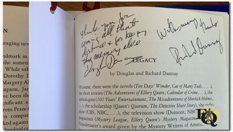 Likewise the other panelists. Joan Richter, first published in Ellery Queen's Mystery Magazine in 1962, met Dannay when she took an adult-ed writing course taught by him when she and Fred both lived in Westchester County (New York State). She and Davis spoke of the pleasure of receiving phone calls from Dannay after he had read their submissions and wished to discuss their stories.