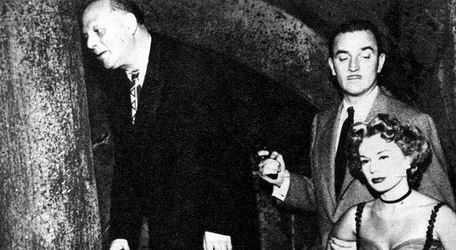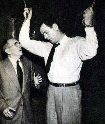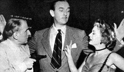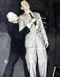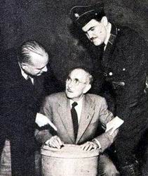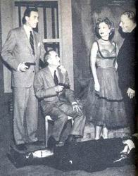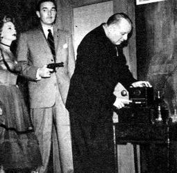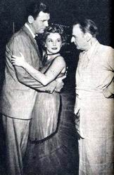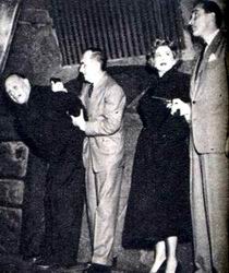 Ellery and his father are surprised to find that the tunnel leads directly to Ilsa's night club dressing room, headquarters for a Red Kidnaping ring. The night club owner appears and retakes the surprised Ellery and dad at gunpoint. He order them to turn around and begin trip back through the tunnel. |