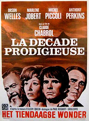 door J.C. 15 mei. 1972 "Out of Control Dit wonder, zoals wonderen duren, duurde negen dagen.' intoneert Orson Welles in zijn beste Eastern Airlines Wings-of-Man-stem. Het beeld snijdt abrupt van een zwart scherm naar Tony Perkins die ligt te woelen en te stuiptrekken in bed. Hij is in de laatste stuiptrekkingen, zo leren we later, van een onsmakelijke drugservaring. Zijn handen zijn doordrenkt met bloed - 'mijn bloed,' snikt Perkins, hoewel hij niet eens een lichte kneuzing lijkt te hebben. Claude Chabrol, die uitblinkt in strak gedisciplineerde oefeningen in suspense ('This Man Must Die', 'Le Boucher'), lijkt zelf even uitzinnig te worden in 'Ten Days' Wonder', waar spanning en inzicht ondergeschikt zijn aan spijtige stilistische flamboyantie. Chabrols camera fladdert rond als een duizelingwekkende flamingo, die van grote hoogten afdaalt om stillevens te belichten als een tuin, een vijver of twee naakte geliefden die verstrengeld zijn in de groene bladeren. De geliefden zijn Charles en Helene (Perkins en Marlene Jobert), de geadopteerde kinderen van de miljonair en tiran Theo Van Horn (Welles). Papa heeft zijn fortuin gebruikt om het jaar 1925 nauwgezet na te bootsen. Het was een opwindende tijd om te leven,' legt hij uit tijdens zijn nachtelijke gourmetmaaltijd, terwijl hij iedereen die hem tegenspreekt streng aan de tafel aankijkt. Charles moet in zijn onderbroek over het landgoed ravotten, maar vindt troost in het beeldhouwen van grote, peinzende Olympische figuren. Helene is een beetje een stijve, een kwaliteit die overtuigend wordt overgebracht door Miss Jobert, die door de film schuifelt in een staat van grootogige rigor mortis. Ook aanwezig is een intellectuele vriend van Charles, Paul Regis (Michel Piccoli), die niet de hersens heeft om te vertrekken nu het nog kan. Charles en Helene biechten hem hun passie op, en Regis ontvangt het nieuws met gelijkmoedigheid. Hij helpt de geliefden zelfs om te gaan met een chanteur en probeert in het algemeen een situatie te verlichten die nog gecompliceerder wordt door het feit dat Helene ook Papa's vrouw is. Het leidt allemaal tot moord, wat alleen maar te verwachten is van een film die gebaseerd is op een roman van Ellery Queen. Er wordt ook heel wat kosmisch gekletst over schuld, straf en verlossing. 'Ten Days' Wonder' ademt een soort verstopt katholicisme, een eigenschap die de jonge Chabrol ontdekte in het werk van Hitchcock, die een zware en niet geheel heilzame invloed op hem heeft gehad. Alles is hier nogal oninteressant uit de hand gelopen, inclusief Orson Welles. Als Welles een wenkbrauw optrekt, ondergaat hij zulke stuiptrekkingen dat het lijkt alsof hij probeert een grote harige boemerang van zijn gezicht de stratosfeer in te slingeren." |