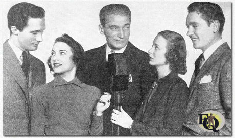 ![]() ![]() Boven links: Gretchen Davidson & Carleton Young in Carol Kennedy's Romance (CBS, 1937) Boven rechts: De cast van Carol Kennedy's Romance: Van links naar rechts, Dr. Owen Craig, Kathy Prentice, Dr. Peter Clark, Carol en Randy. Gretchen Davidson speelt de titelrol in het Heinz Magazine programma en Carleton Young vertolkt de jonge chirurg op wie Carol heimelijk verliefd is. De levendige Mitzi Gould is Kathy Prentice in de uitzending - de glamoureuze nicht van Carol en, als verloofde van Dr. Craig, een barrière tussen de heldin en de man van wie ze houdt. In Gene Morgan zie je Gary Crandall, een verveelde jongeman in de stad, die ervoor kiest om de peetvader van Carol te spelen. Verder op de foto staan Edwin Jerome, de Dr. Peter Clarke van het verhaal, en Ted Reid die Randy speelt. (apr 1938) |