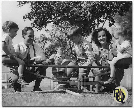 ![]() Boven: Stoere kerel is familieman: Harry Morgan, meestal een stoere vent in films, is heel erg een familieman. Al zijn vrije tijd brengt hij door met spelen met zijn vier zonen in de achtertuinspeeltuin van het huis van de Morgans in de San Fernando Valley. Op de foto geven Harry en zijn vrouw hun tweeling een ritje terwijl twee oudere zonen over voetbal praten. De tweeling zijn Danny (L) en Paul, in de andere stoel. Chris, 6 1/2 jaar oud, houdt de bal vast, en Timmie, 5, maken plannen voor een vangst. (1949) |