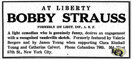 ![]() Above: Add for Bobby Strauss "At Liberty" in Variety September 1919. |