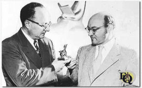| Boven: Manfred B. Lee en Frederic Dannay met hun Gouden Gertrude, toegekend door Pocket Books, Inc. voor een boekenverkoop van meer dan 5 000 000 exemplaren van Ellery Queen Pocket Books uitgaven (1934). | |||||||||